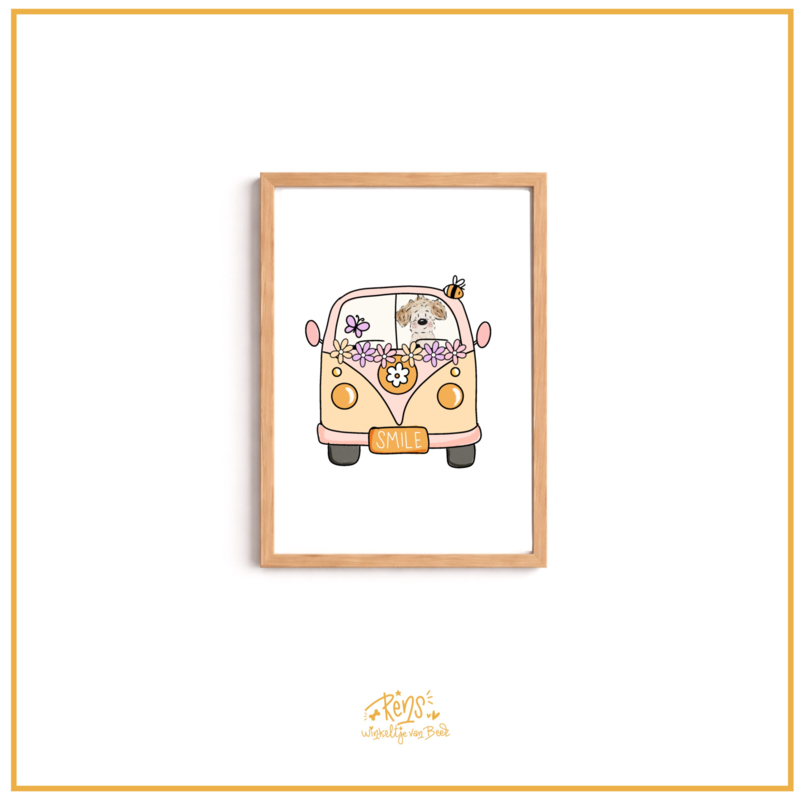 Stap samen in de bloemenbus en maak een vrolijke lentetocht. In deze restyle rijdt jouw cartoonhondje mee in een gezellige retro bus vol bloemetjes, bijtjes en zachte pastelkleuren. Een mini-tafereeltje dat voelt als zon op je snoet, ramen open en samen op avontuur.